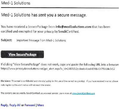 Med-1 saw it differently — Lavallee’s November 2015 telephone call was not the initial communication concerning her debts. Instead, it was two emails Med-1 had sent Lavallee, one for each debt, in March and April 2015. And both emails contained the 1692g(a) disclosures. The emails, similar in form, came from “info@med1solutions.com” and were sent to the email address Lavallee provided to the hospital. The emails stated “Med-1 Solutions has sent you a secure message” and contained a hyperlink embedded in the text “View SecurePackage.” Clicking on the link would take the recipient to the validation notice containing the information and disclosures required by 1692g(a). The emails didn’t say much else as can be seen from the reproduction contained in the court’s opinion: